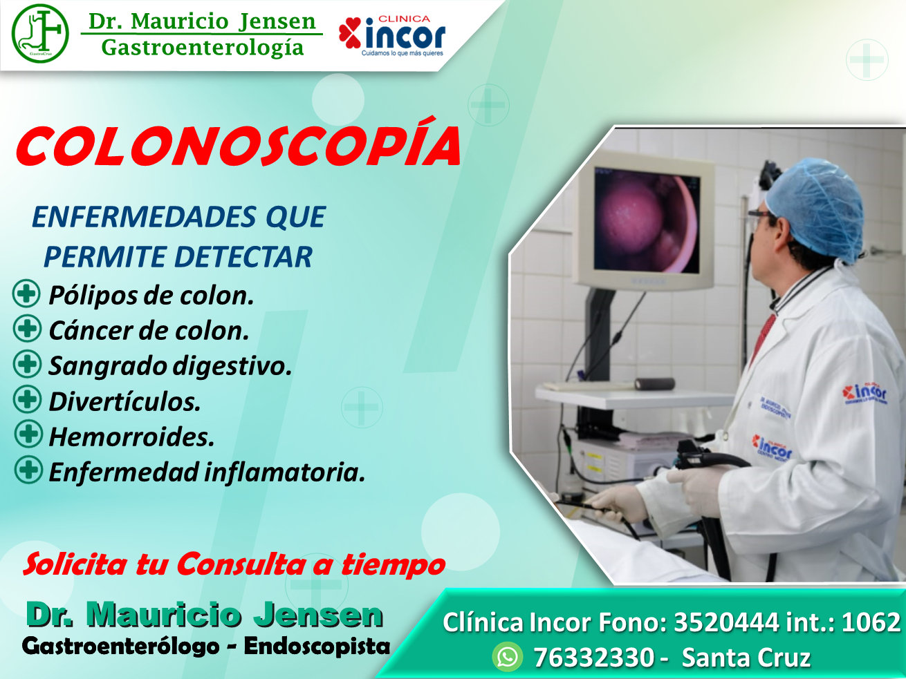 Informes al 3520444 Int. 1062, Cel. 76332330 para programar tu cita con el Dr. Mauricio Jensen.